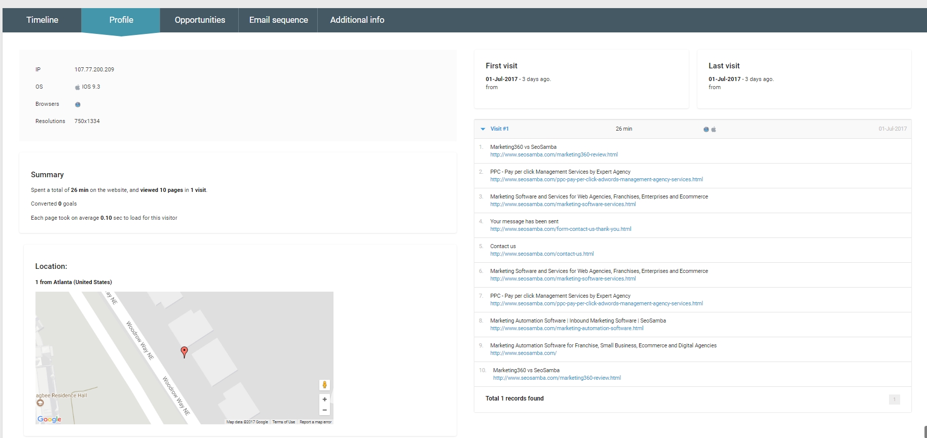 SeoToaster CRM Ultimate Edition vous montre une richesse de données pour un lead que vous n'obtiendrez pas avec votre outil d'analyse gratuit habituel.